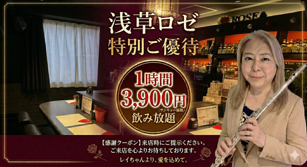 今回お世話になった感謝を込めまして、私がおります「浅草ロゼ」でご利用いただける特別クーポンをご用意しました。